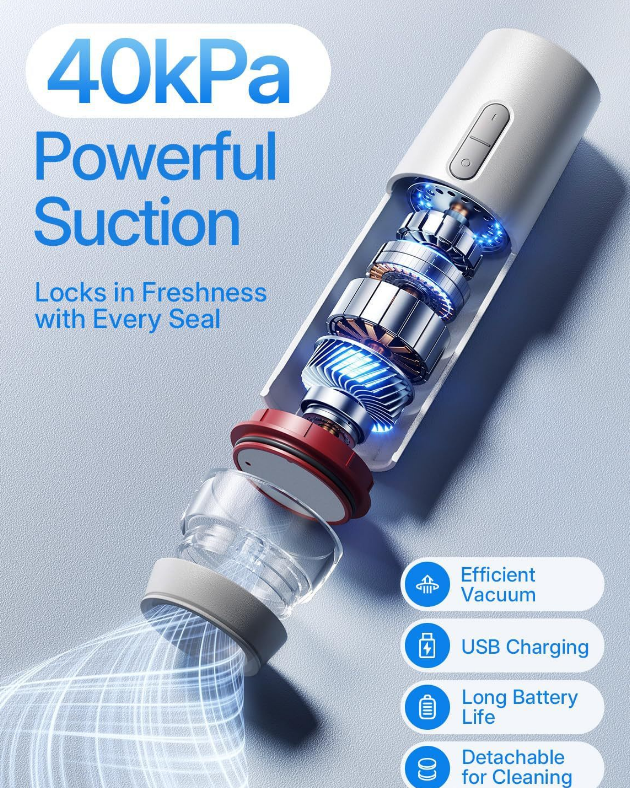 The device is crafted from durable PP materials and features a smart, ergonomic grip. One of its standout features is the easy-clean design; the bottom suction head can be detached and rinsed to maintain hygiene (ensure the main motor unit stays dry). Whether you are sealing a steak for the weekend BBQ or packing snacks for a road trip, this handheld sealer delivers professional results with the press of a button.